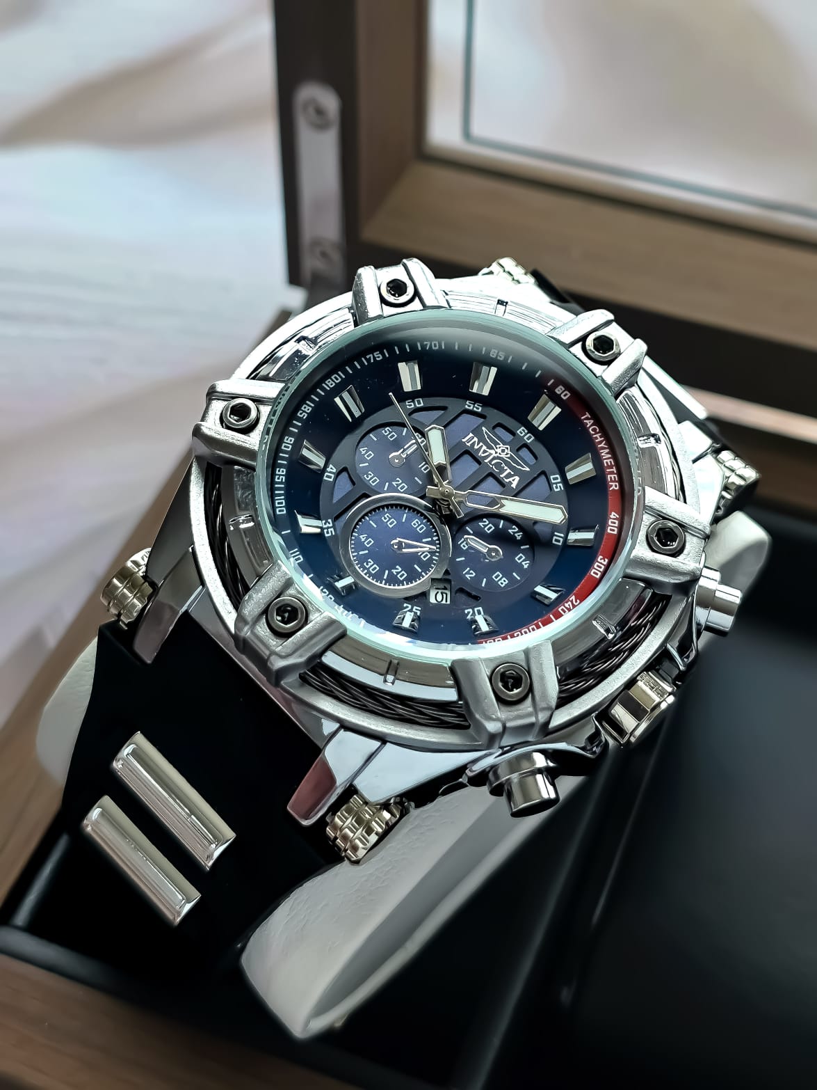 NEGRO CON DETALLES PLATEADOS Y CARATULA AZUL.