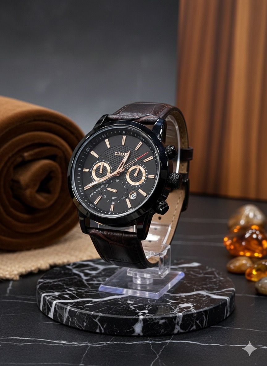COLOR NEGRO CON CORREA DE CUERO CAFE Y DETALLES DORADOS